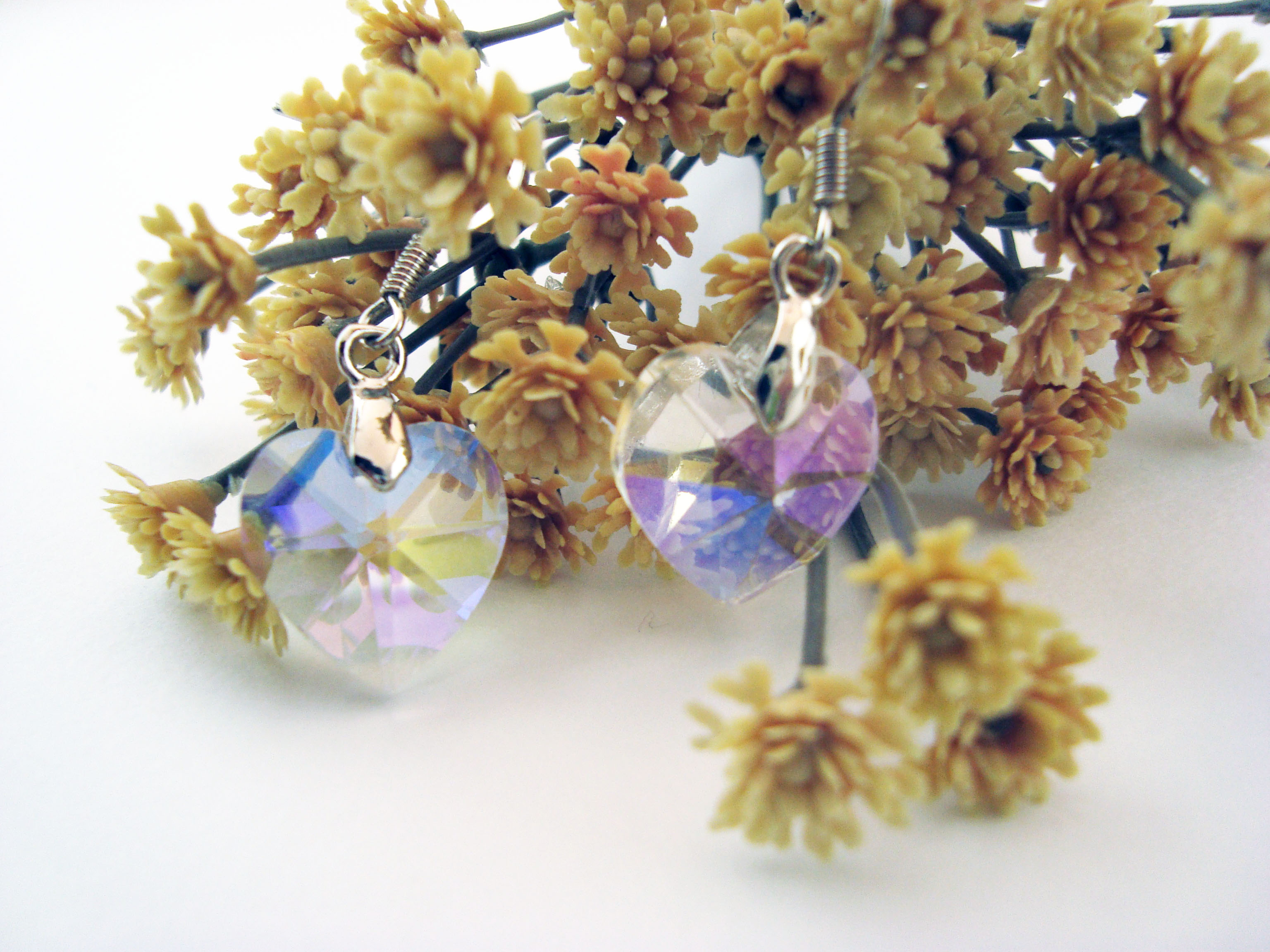 Add some sparkle to your wardrobe! These earrings are great for any occasion! Dress them up or down! Handmade earrings with iridescent crystal glass heart charms on silver tone bails with silver tone fish hook earring wires.