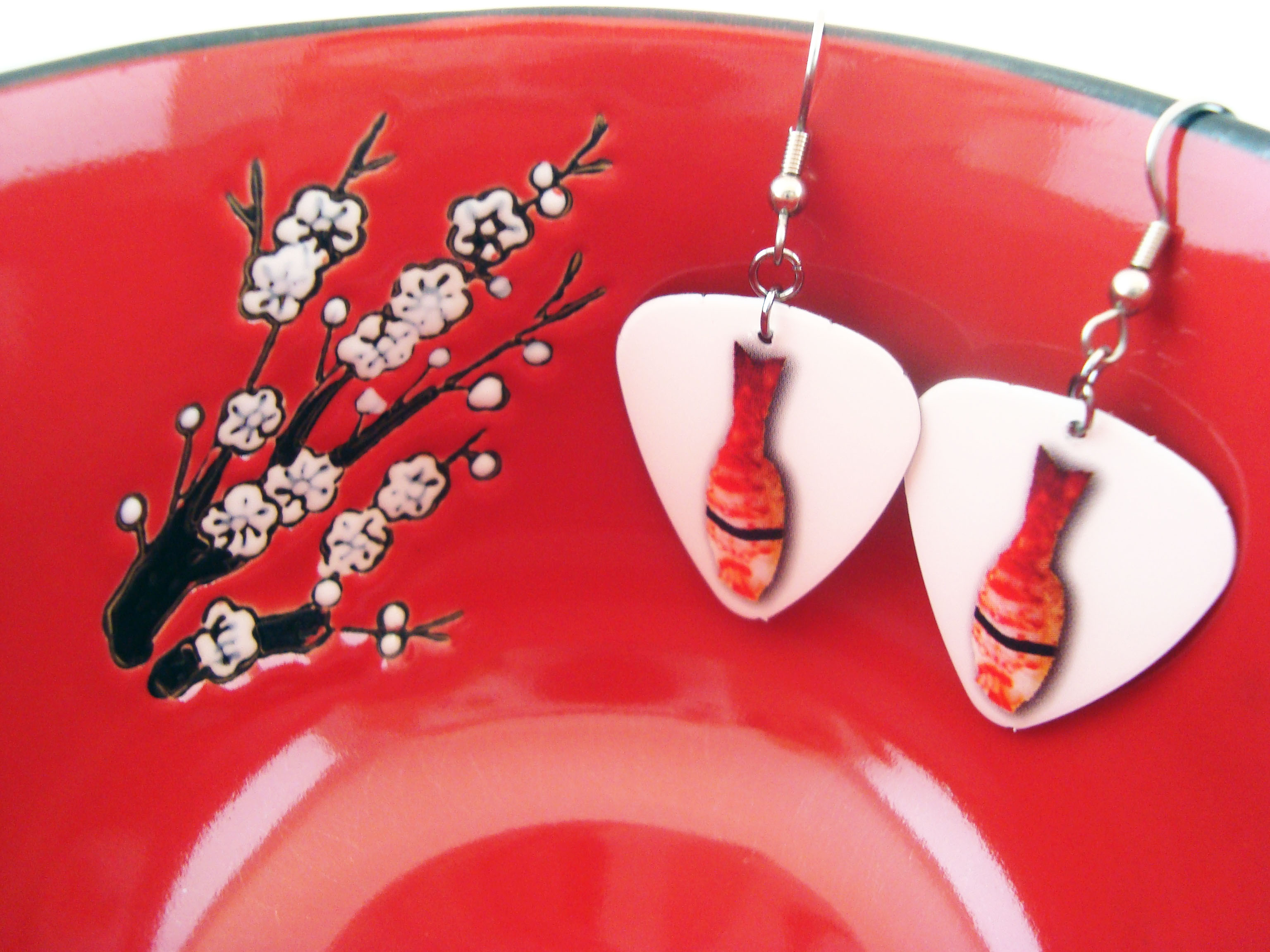 Shrimp Samba - Guitar Pick Shrimp Sushi Themed Dangle Earrings