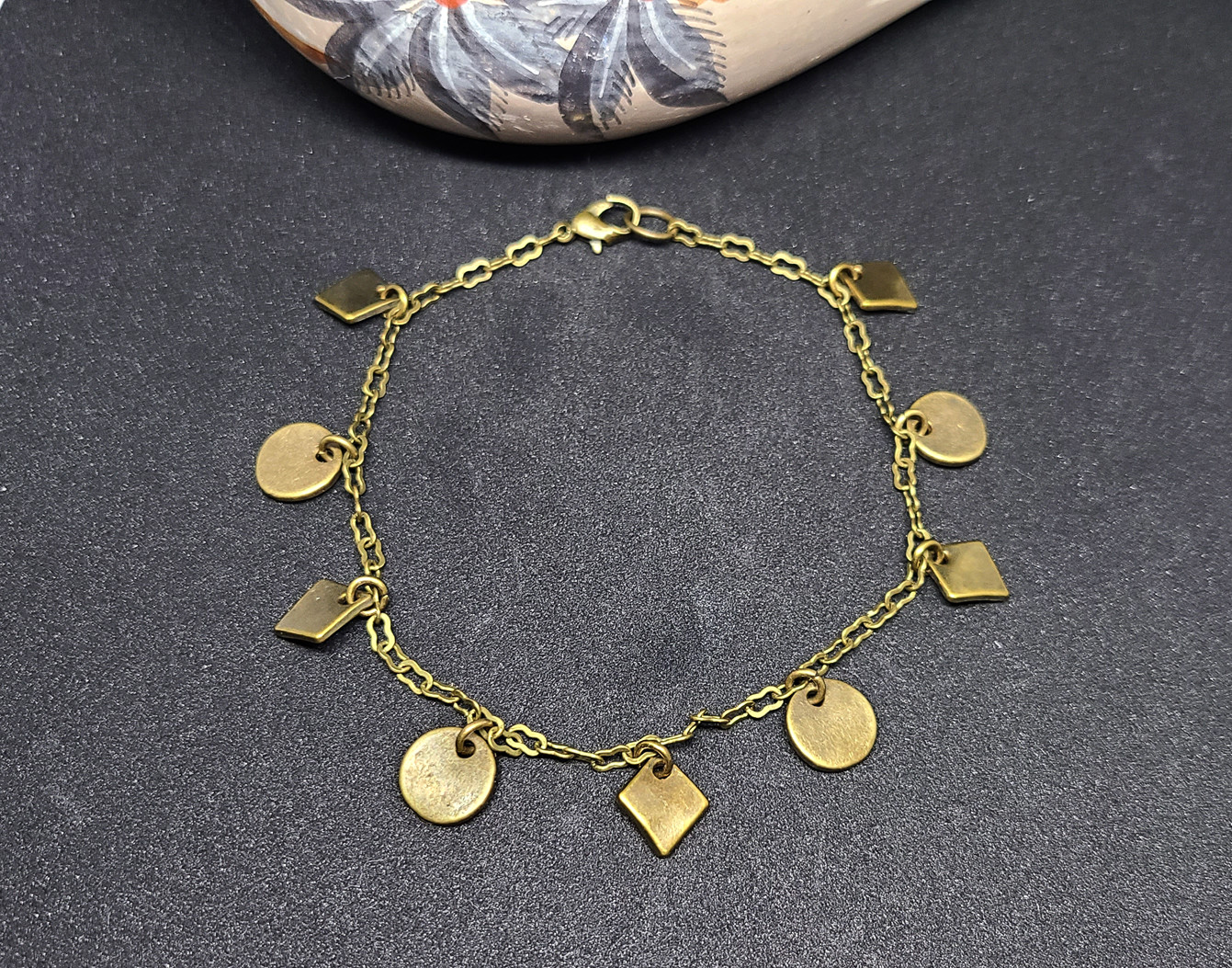 This is a matching set of earrings with an anklet! You can choose if you want to buy them separately or together in the drop-down menu. The anklet is made of antique gold tone metal diamond-shaped & circle-shaped charms on an antique gold metal 'peanut' chain with a lobster clasp closure. The earrings are made of matching antique gold tone metal charms.