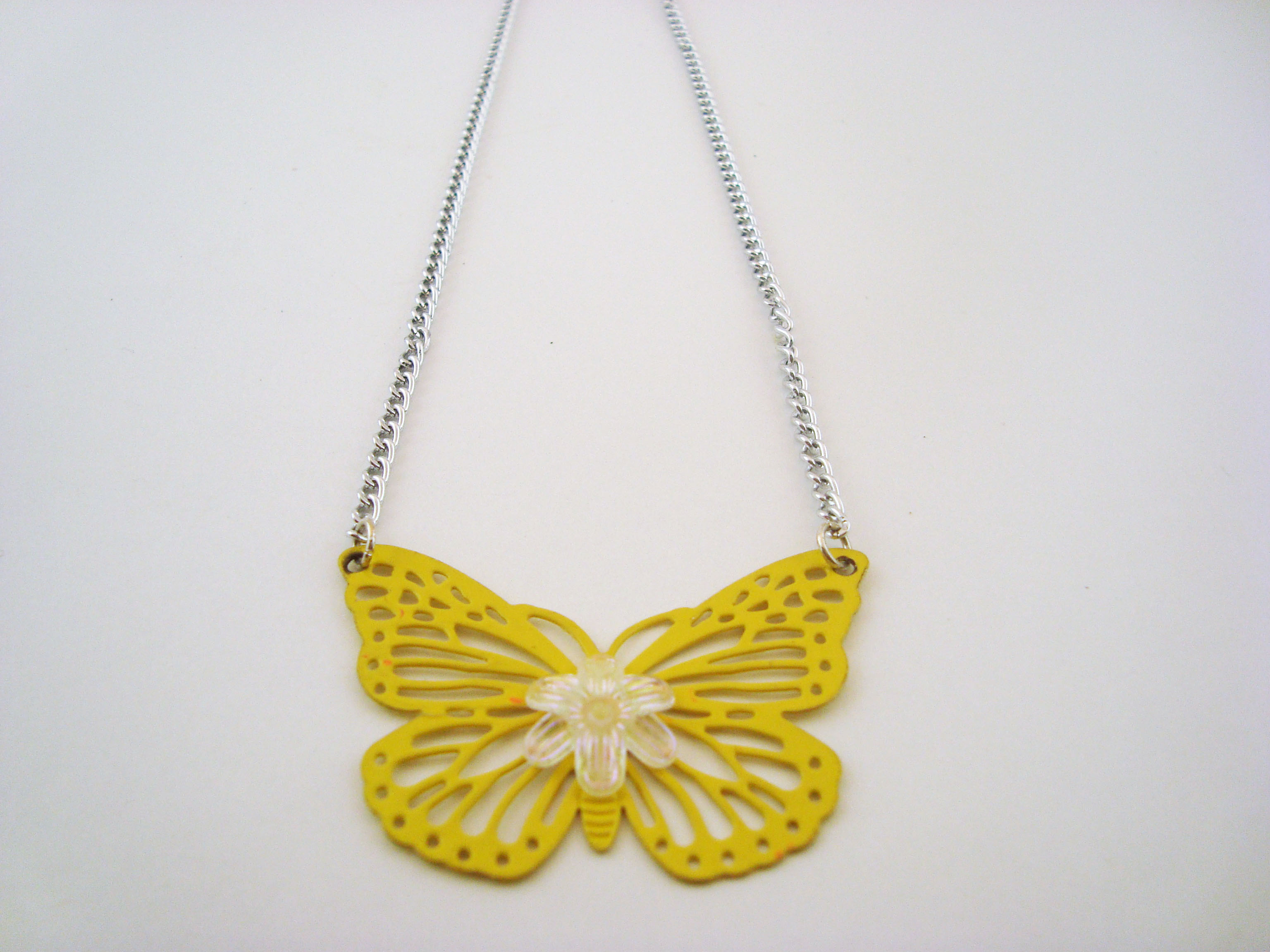 Handmade from an enamel YELLOW upcycled metal butterfly pendant embellished with an iridescent plastic flower bead with silver tone chain with lobster claw closure.