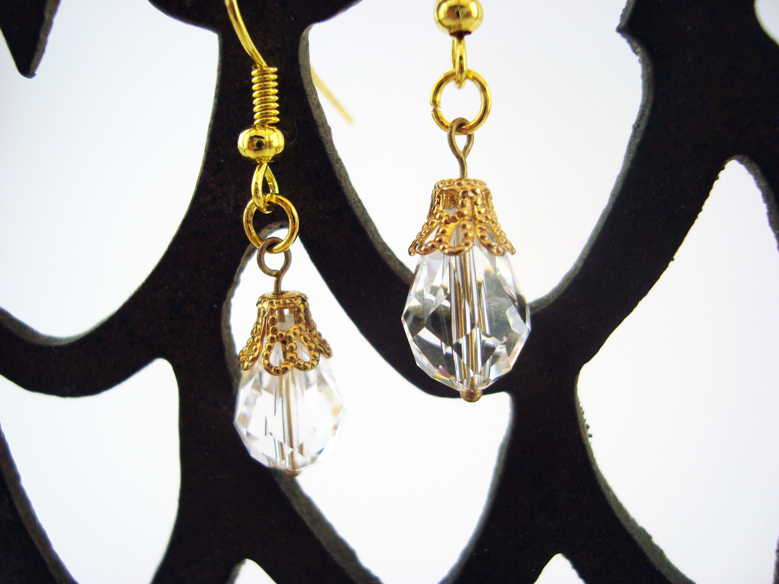 Beautiful Swarovski crystal earrings for any special occasion or even with casual everyday outfits! Handmade earrings with clear Swarovski glass crystal beads with gold tone filigree bead caps on gold fish hook earring wires.