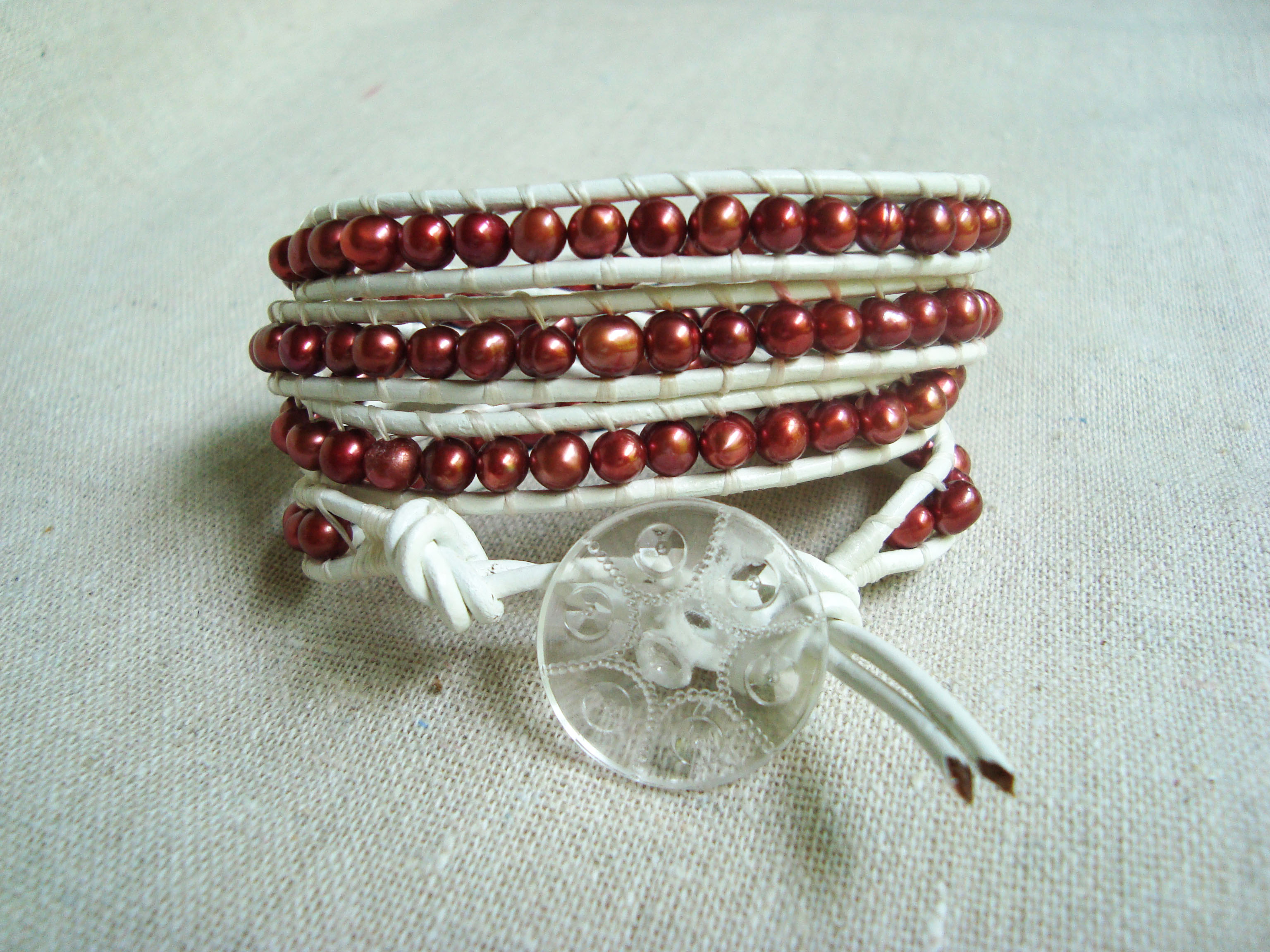 Handmade and hand beaded MAROON freshwater pearl and WHITE leather multi-wrap bracelet. Slip knot with a VINTAGE CLEAR ACRYLIC button closure. Has ONLY 1 loop for the button closure. This bracelet measures approximately 28 inches and wraps 2-3 times (or even 4!) on average wrists.
